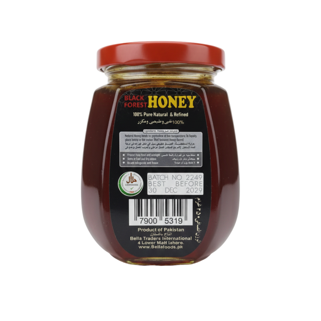 Feature Details Brand Bella (The Natural Choice) Honey Type Black Forest Honey Available Sizes 250 grams & 450 grams Origin Natural Forest Harvest Website bellafoods.pk